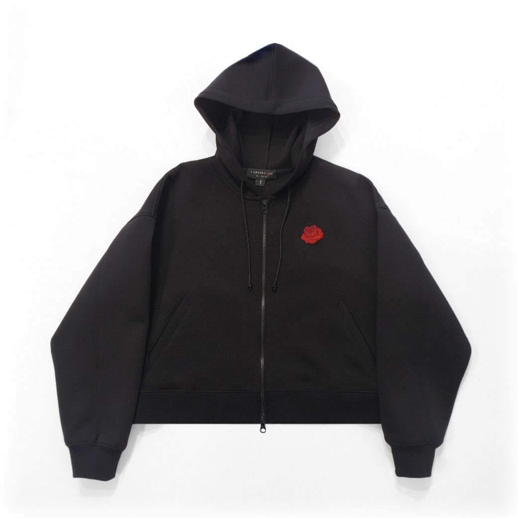 Felpa a manica lunga in cotone tecnico nero, cappuccio e rosa rossa ricamata..