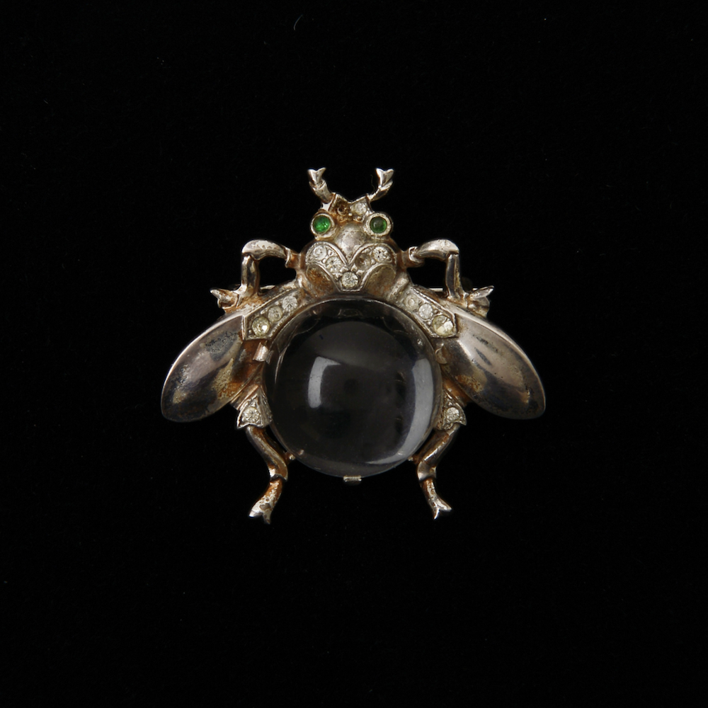 Spilla jelly belly «big fly» in sterling dorato, lucite e strass, a forma di mosca, marchiata «Trifari sterling des. Pat. No. 137200», Trifai, U.s.a., 1944