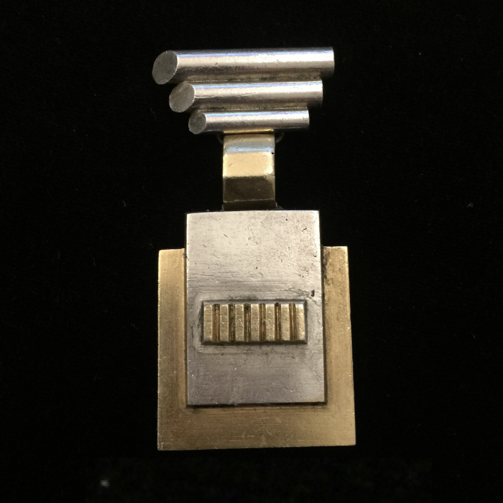 Spilla barretta art deco’ con pendente a distintivo, in metallo argentato e dorato, punzonata «r.m. Jne» «deposee made in France», rene’ mittler, Francia, 1930 c.