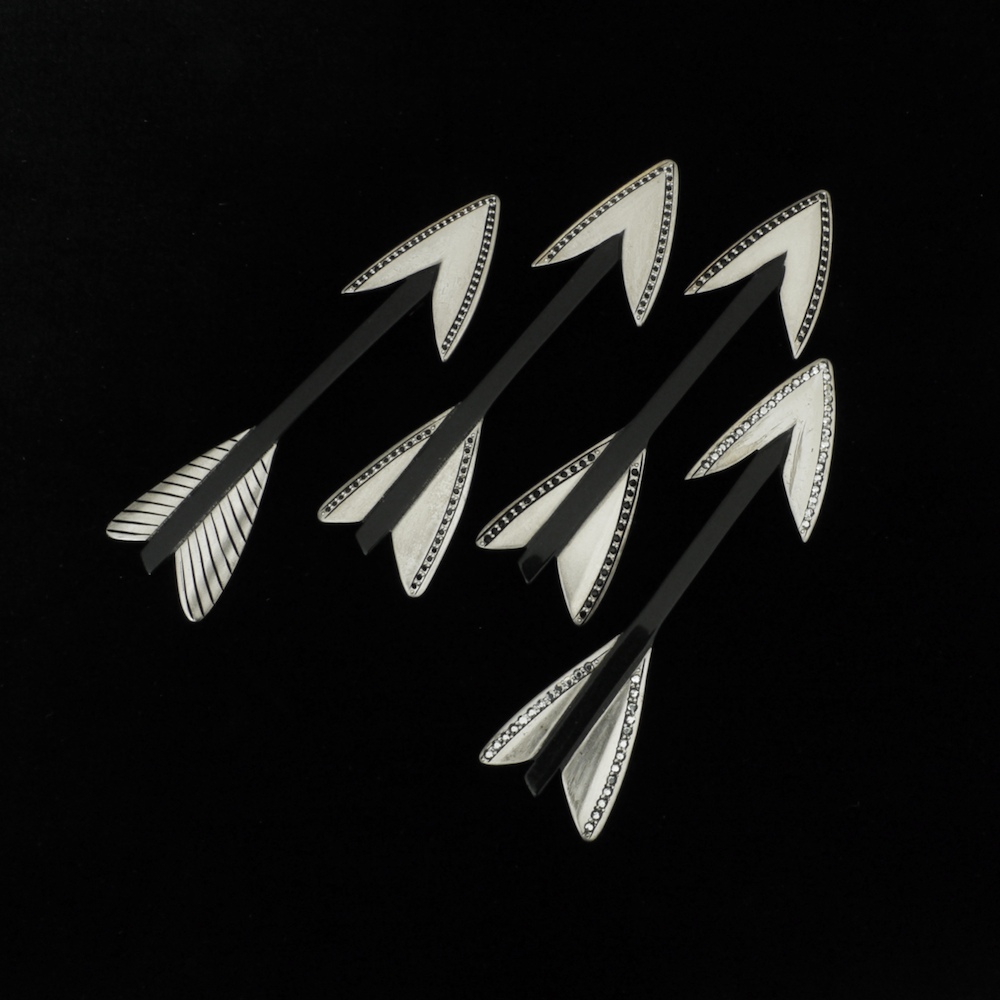 Spilla a forma di freccia in galalite nera, smalto col. argento, strass col. Neri/piccole borchie in marcassite
