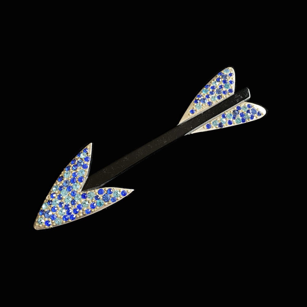 Spilla a forma di freccia, galalite e strass blu e azzurri, maison Auguste Bonaz, Francia, 1920 ca