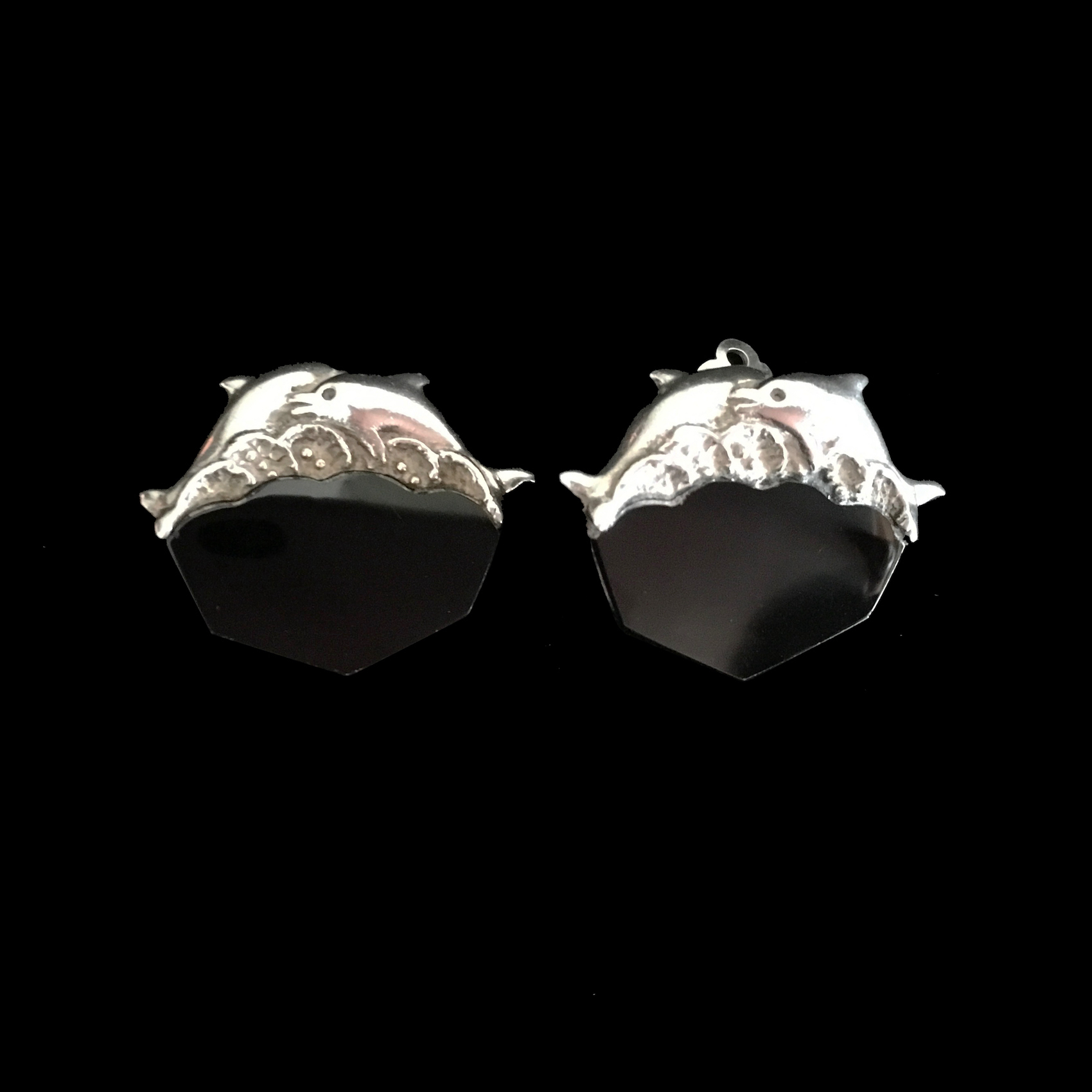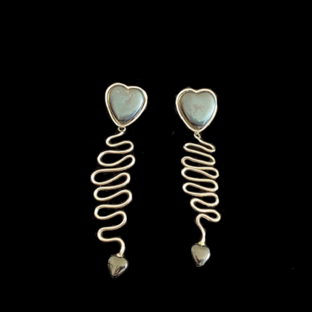 Coppia di orecchini pendenti decorati da due cuori in resina nera collegati fra loro da una spirale in metallo argentato, 1980 c. attr. Krizia
