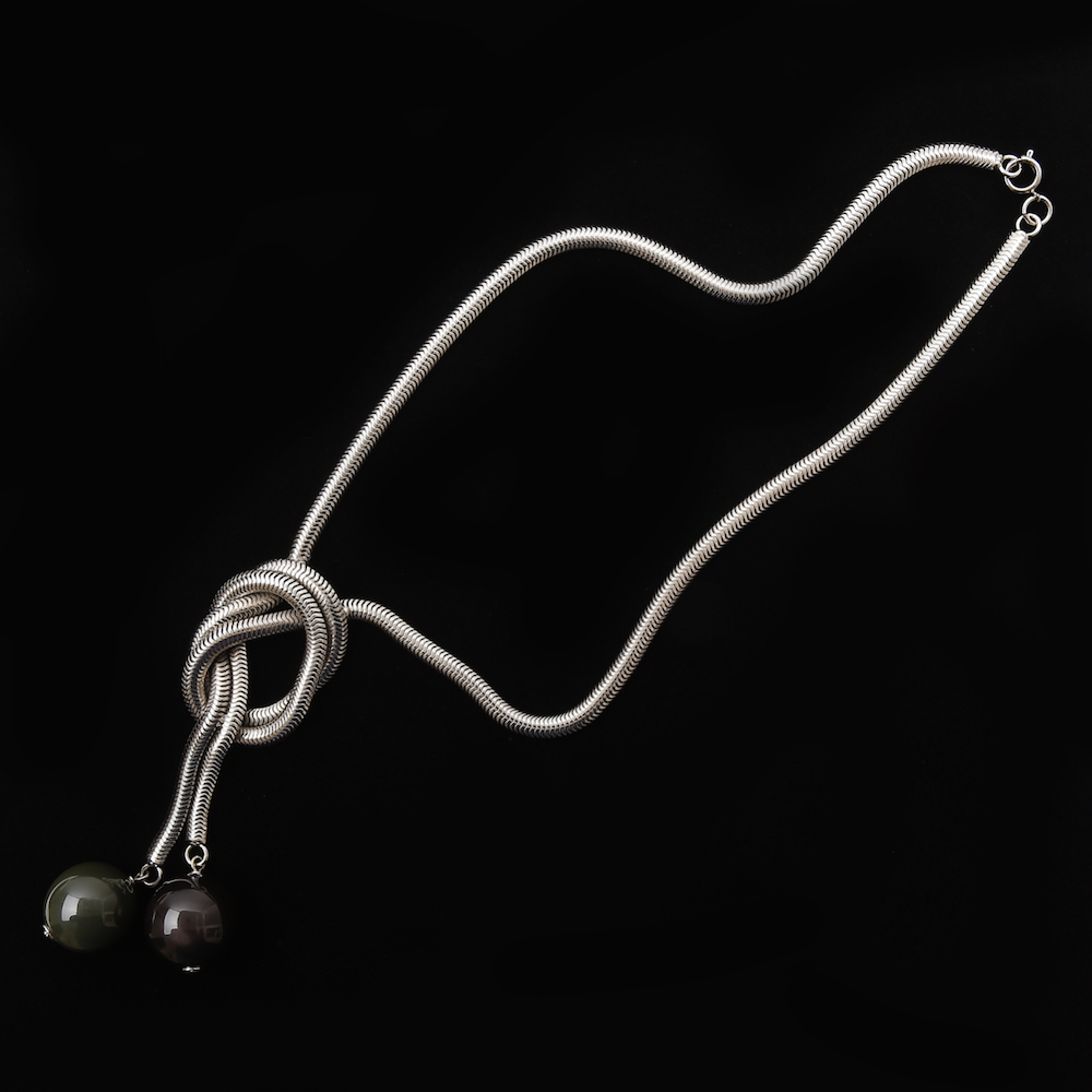 Collana con due sfere pendenti in galalite e catena a coda di topo con nodo centrale, Jakob Bengel, Germania, 1935 c.