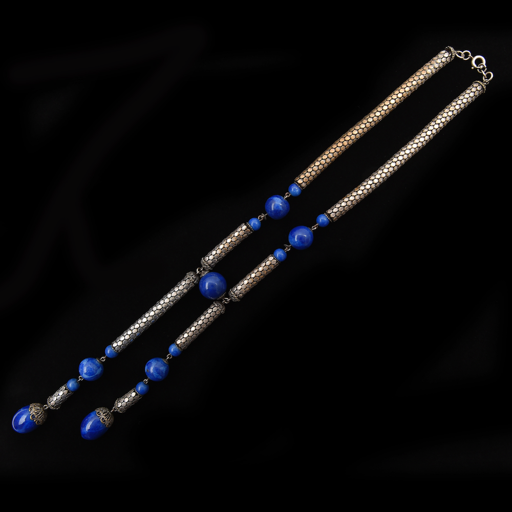 Collana con due pendenti, realizzata in metallo argentato e perle in pasta di vetro simulante il lapislazzuli, Germania, 1925 c.