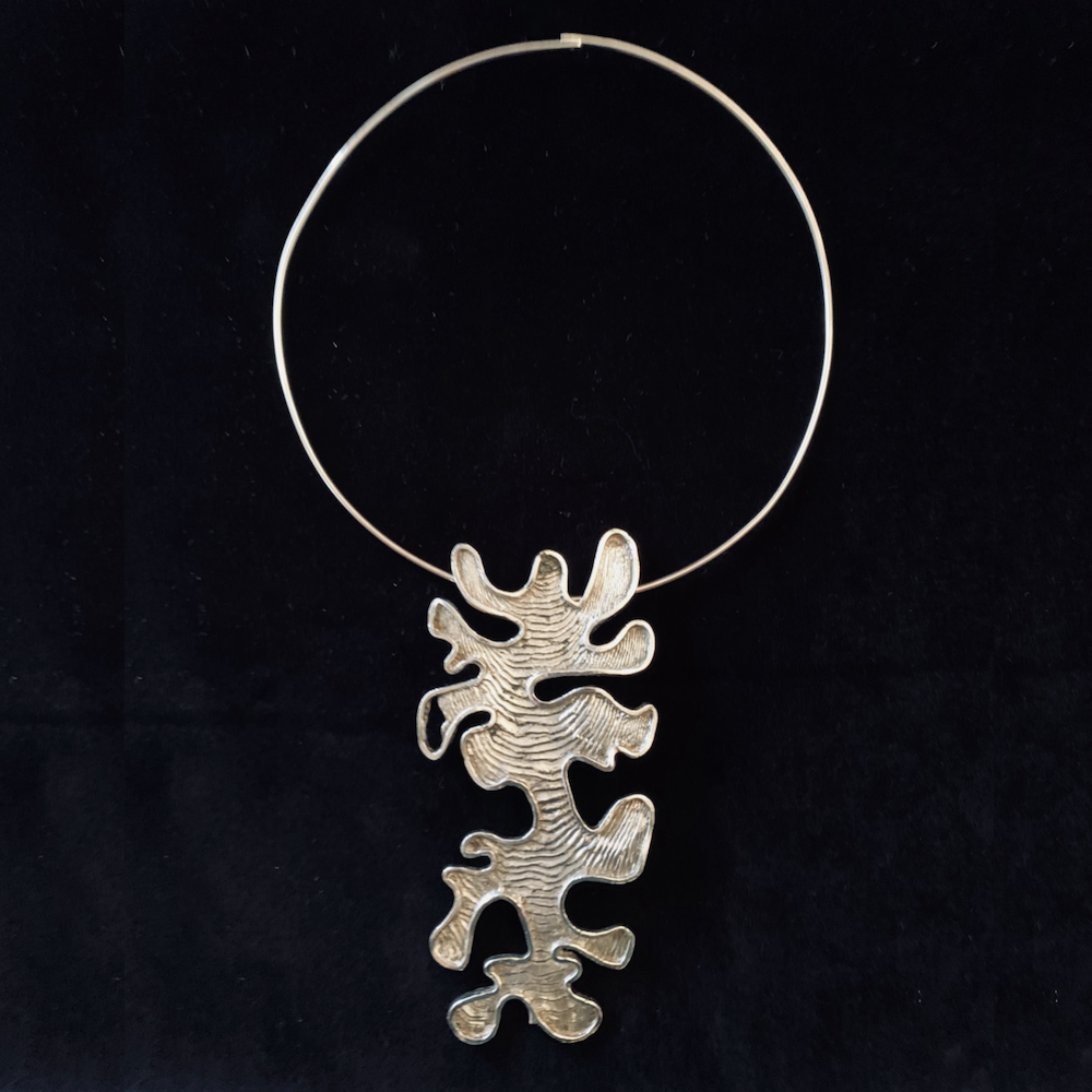 Collana a girocollo (anello) rigido con grande pendente modernista di forma astratta, realizzata in argento sterling, firmata «Ludmila Kochatoff Arneau Lyon», 1970-79 c.
