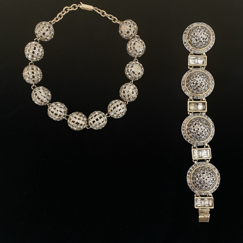 Set composto da collana + bracciale realizzato in metallo dorato, sfere e mezze sfere tempestate da pave’ di strass