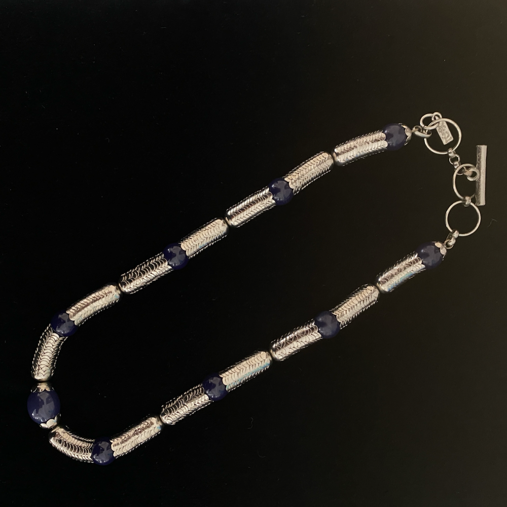 Collana composta da coppette in metallo argentato alternate a sfere in resina blu, punzonata «Ysl», Francia, 1980 c.