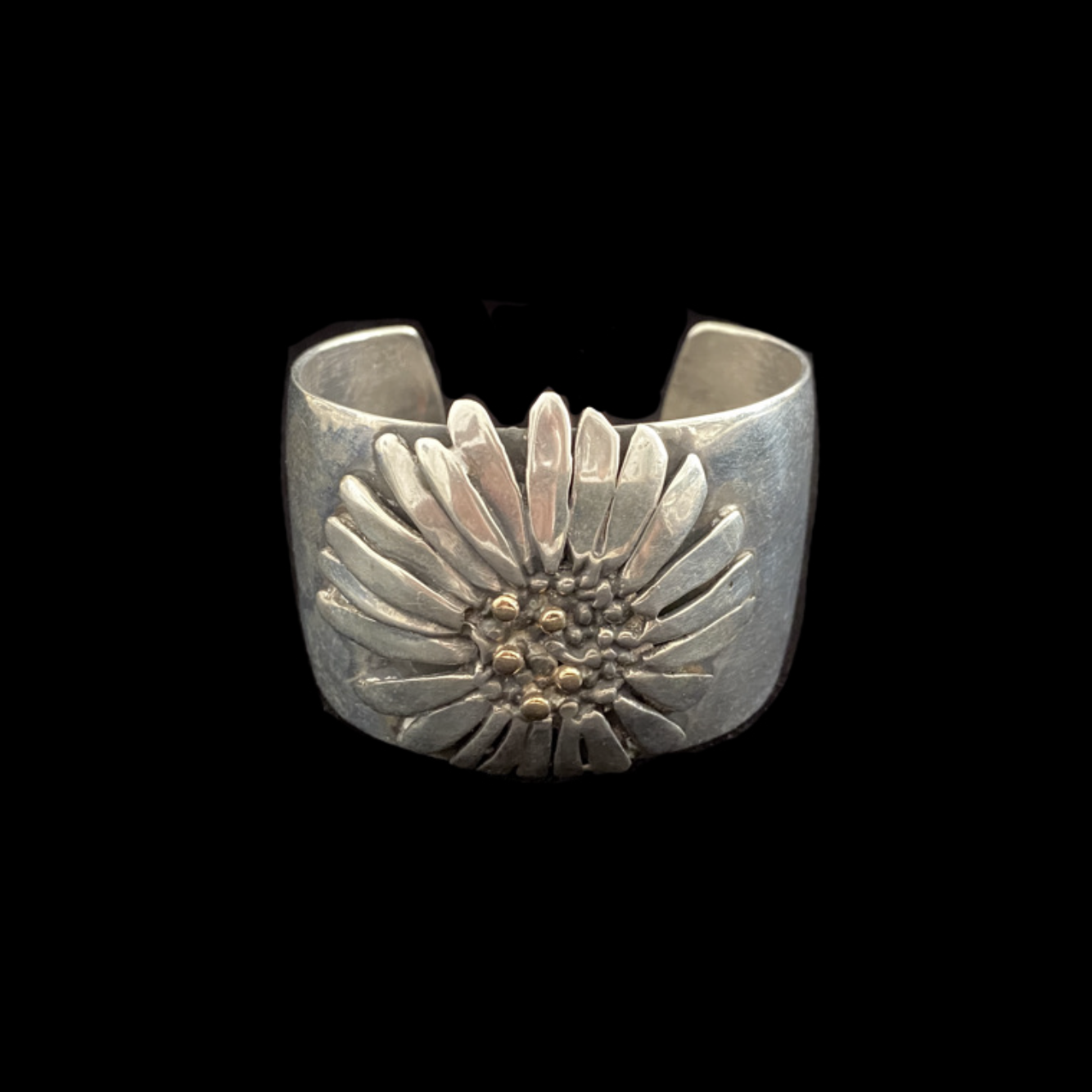 Cuff bracelet realizzato a mano, in argento sterling, decorato con motivo di fiore, punzonato «handmade» «sterling», 1990 c.