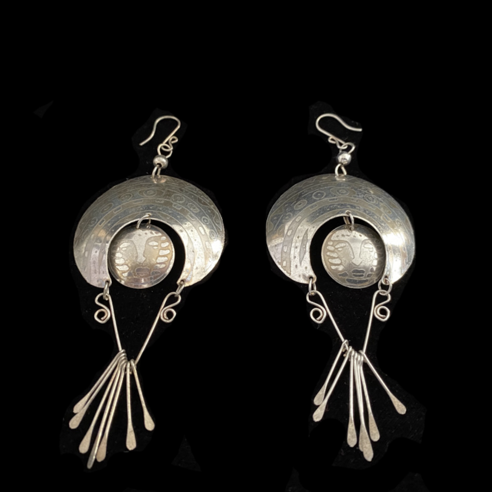 Coppia di orecchini in stile hippy, pendenti a forma di cerchio decorato con volto umano e a forma di piumette, realizzati in argento, punzonati «Laton Mexico», Messico, 1980 c.