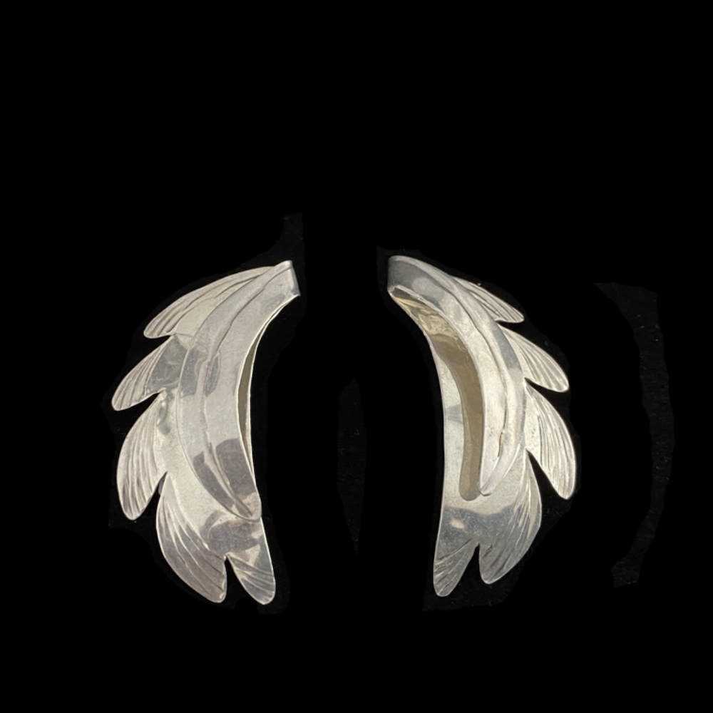 Coppia di orecchini a forma di foglia tridimensionale, realizzati in argento sterling, punzonati «sterling», 1980 c.