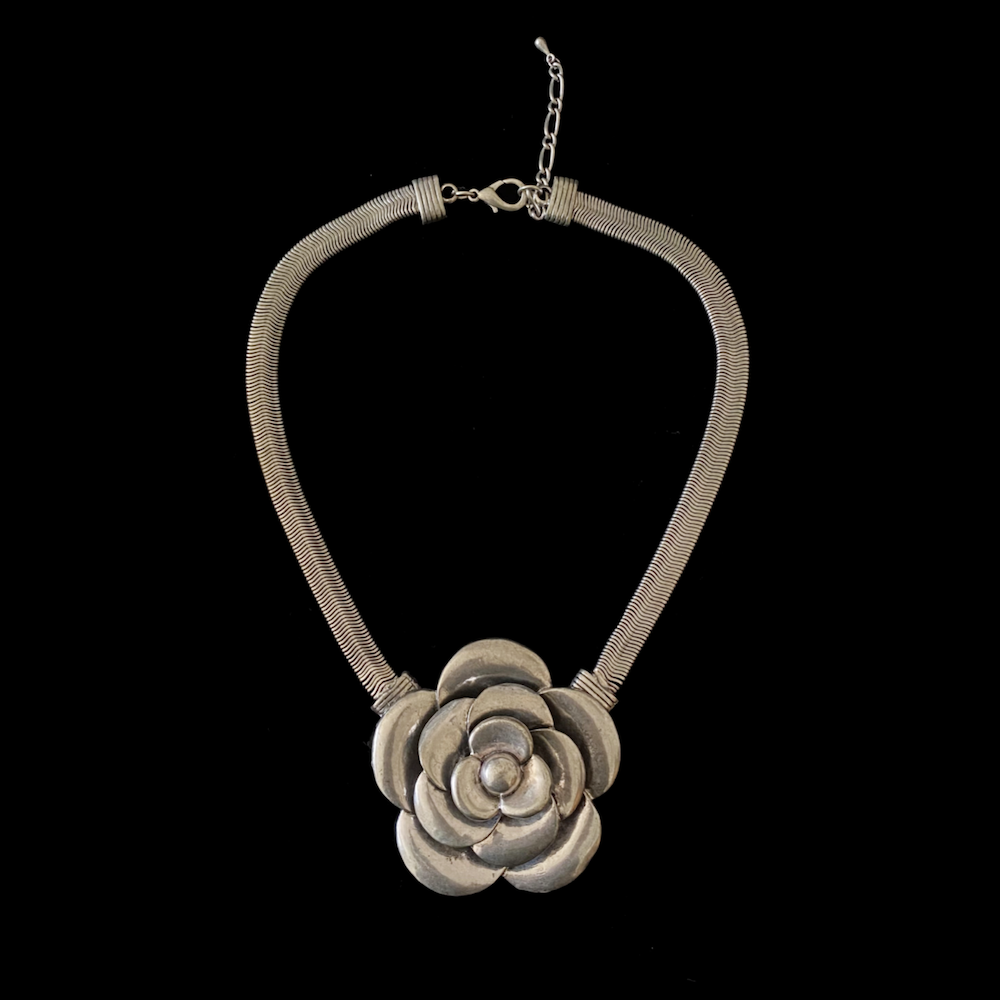Collana realizzata in metallo argentato, catena maglia serpente ed elemento decorativo centrale a forma di fiore, 1990 c.