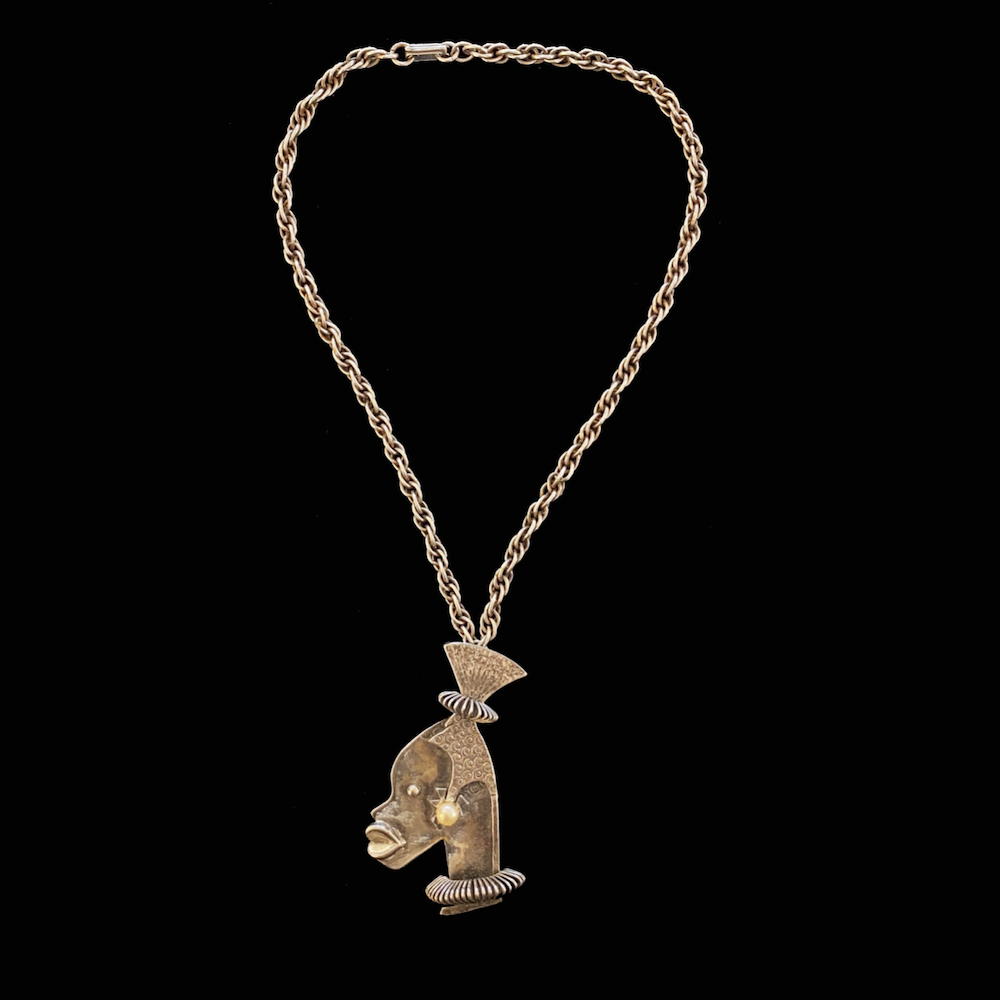 Collana con ciondolo a forma di volto di donna africana, realizzata in metallo argentato, punzonata «Rebajes», Francisco Rebajes, U.s.a., 1940 c.