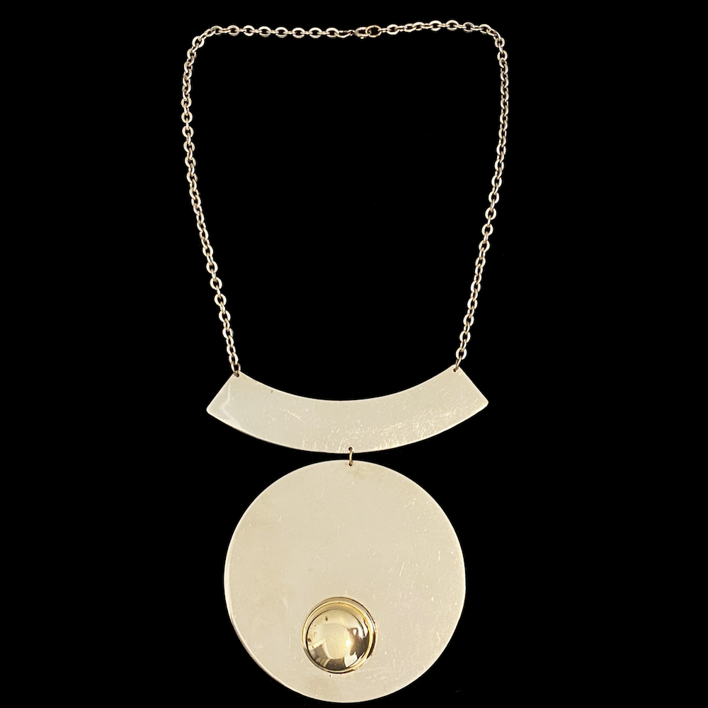 Collana a pettorina con grande disco pendente decorato da una semisfera, realizzata in metallo argentato, 1970 c.