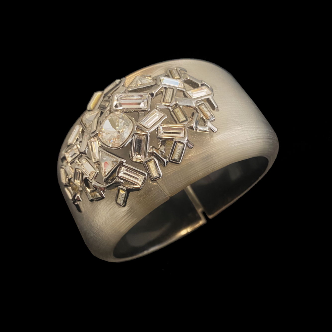 Cuff bracelet realizzato in lucite grigio perla, decorato da un’applicazione di strass, punzonato «handcrafted by Alexis Bittar», Alexis Bittar, U.s.a., 1985 c.
