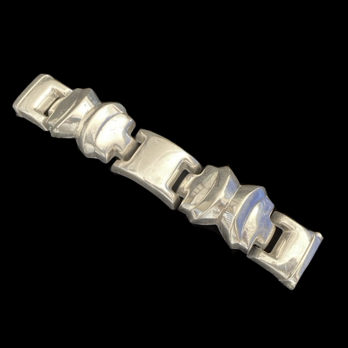 Bracciale snodato in argento 925 in stile neo-deco con elementi dalle linee geometrizzanti incernierati tra loro a scomparsa, marchiato «as 333 ar 925 ita», alunno e stendardi, italia, 1980 c.