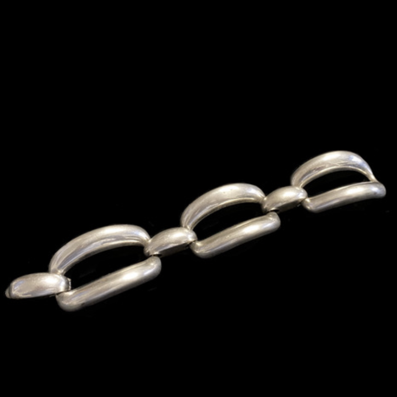 Link bracelet/bracciale modernista in metallo argentato, punzonato «celebrity», celebrity, U.s.a, 1965 c.
