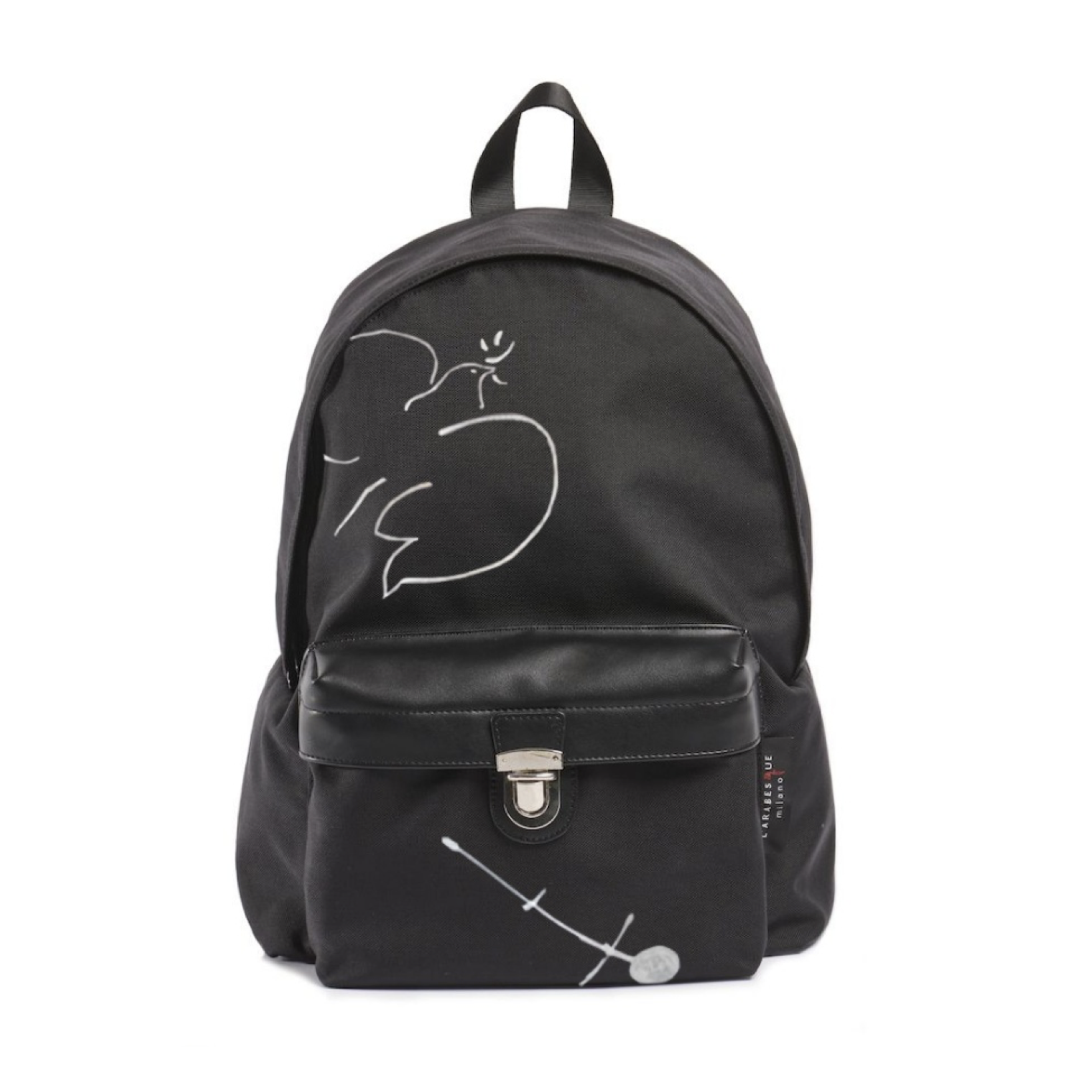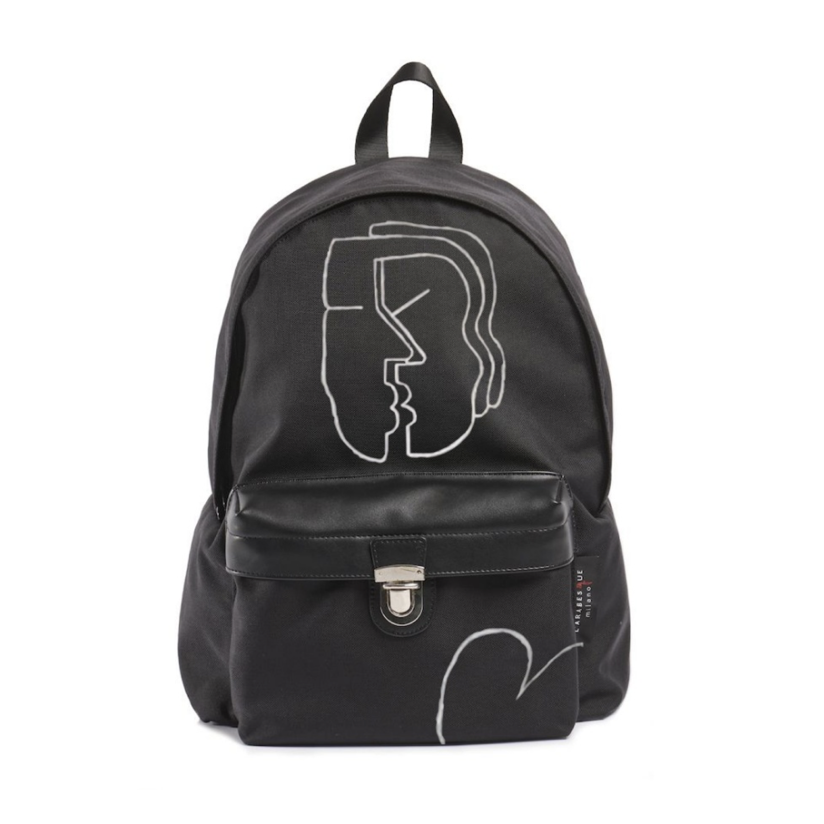 Borsa zaino in tessuto nero con logo stampato a contrasto bianco, dettagli in cuoio nero.