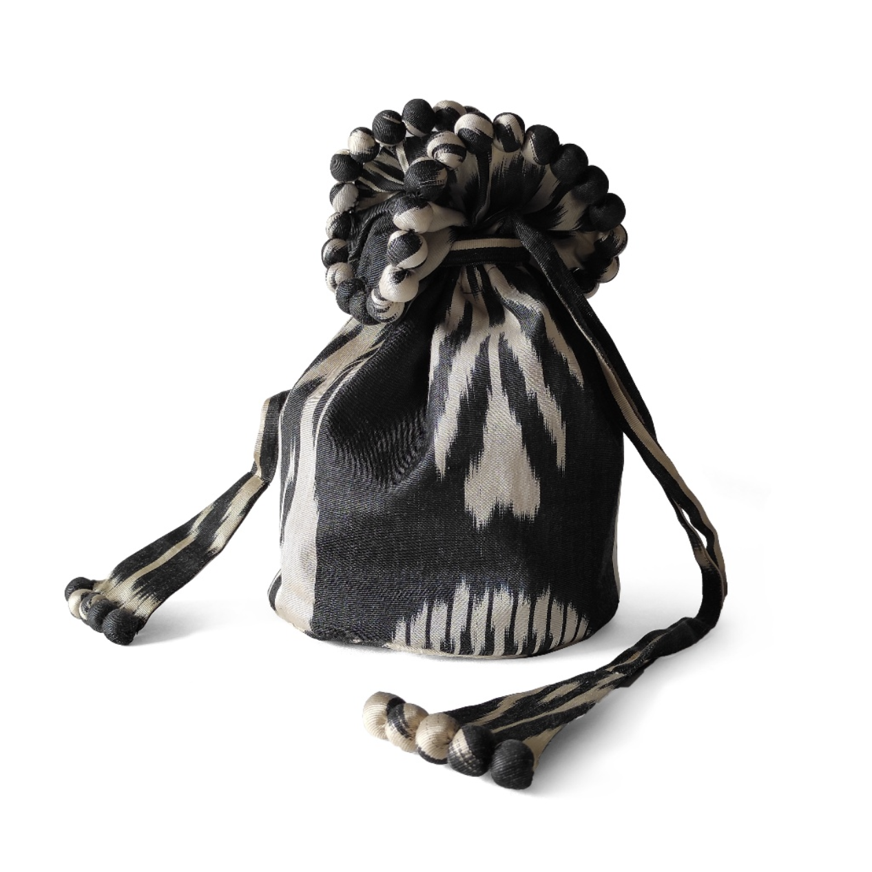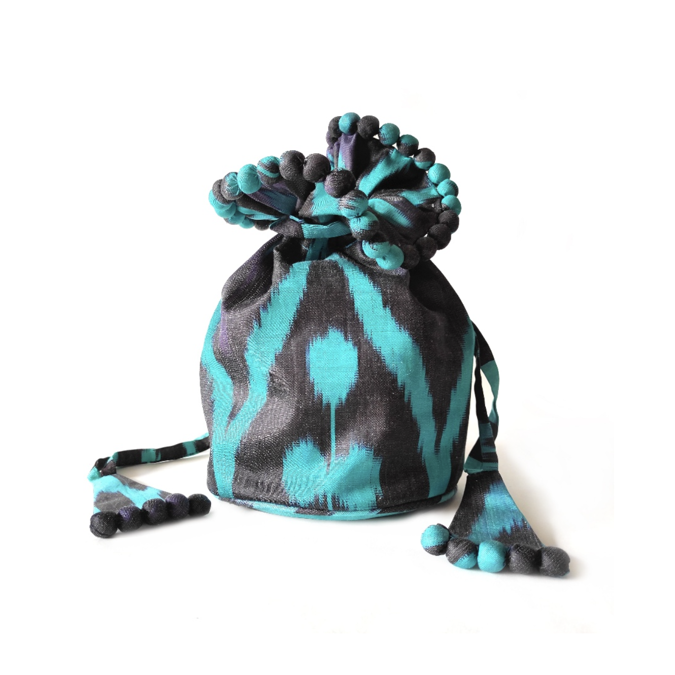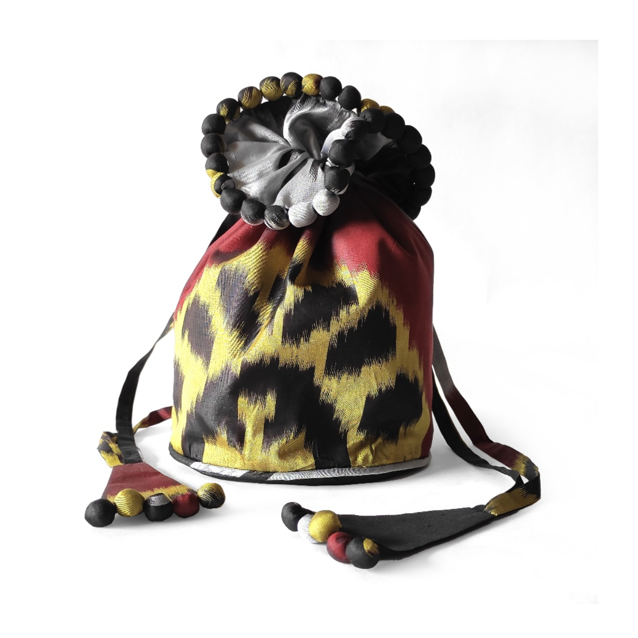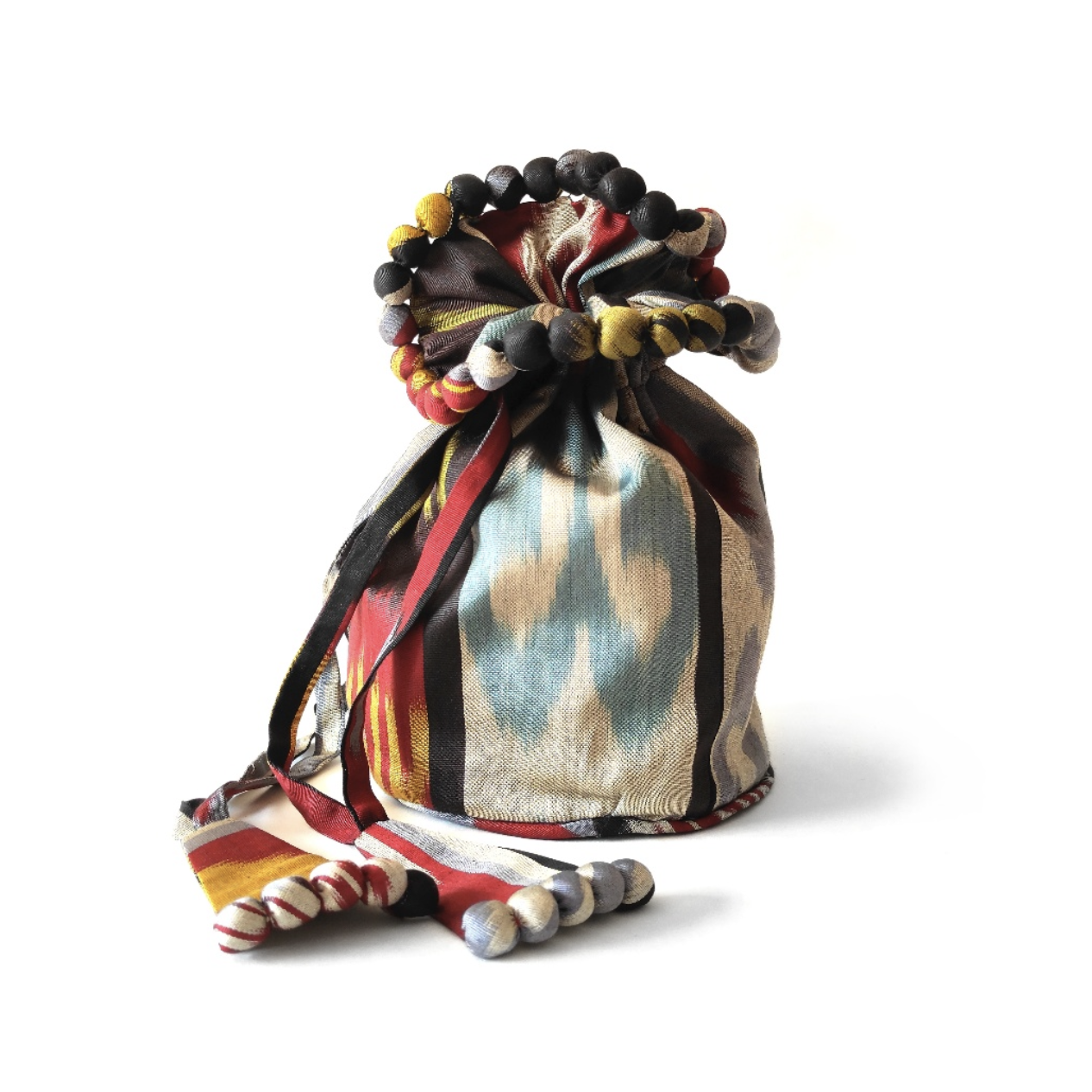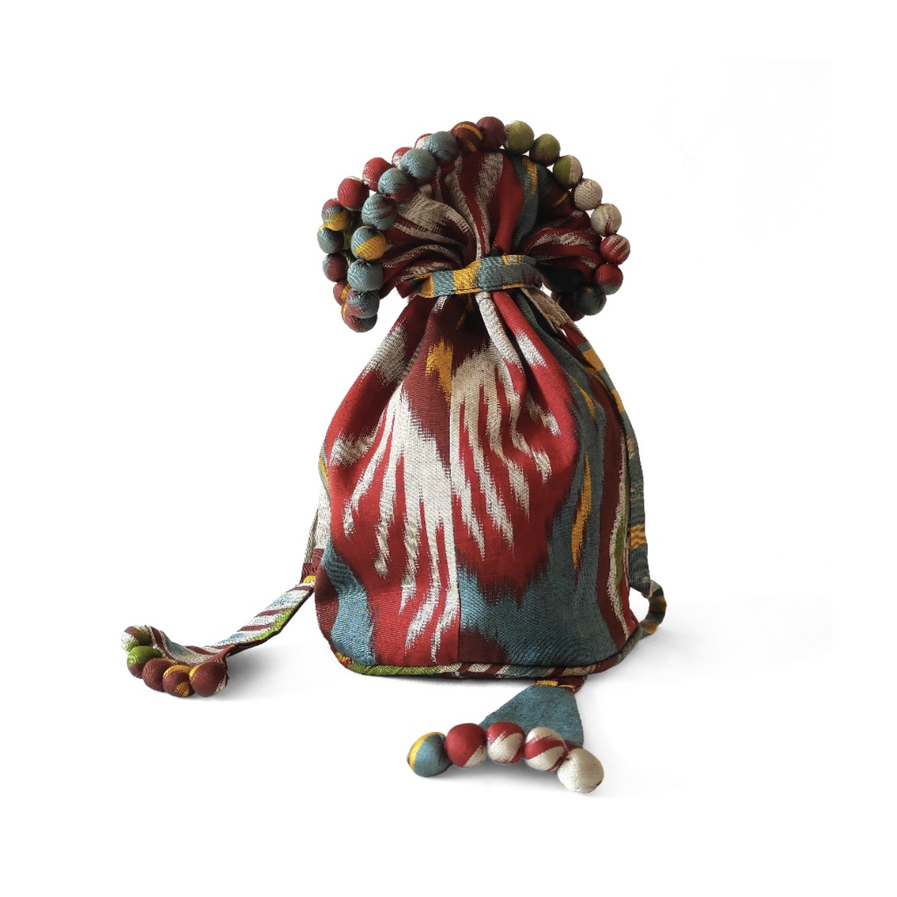 Borsa a sacchetto in tessuto jacquard uzbeko multicolor con nappine decorative e tracolla.