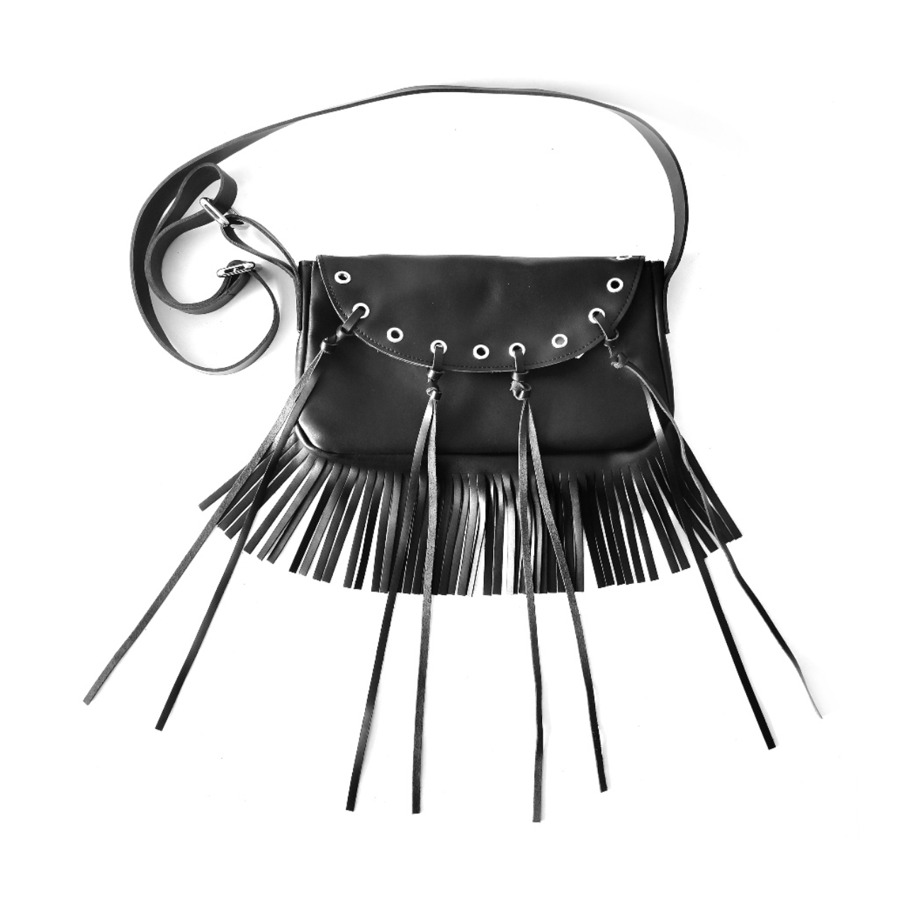 Borsa a tracolla in nappa nera con frange e borchie in metallo.