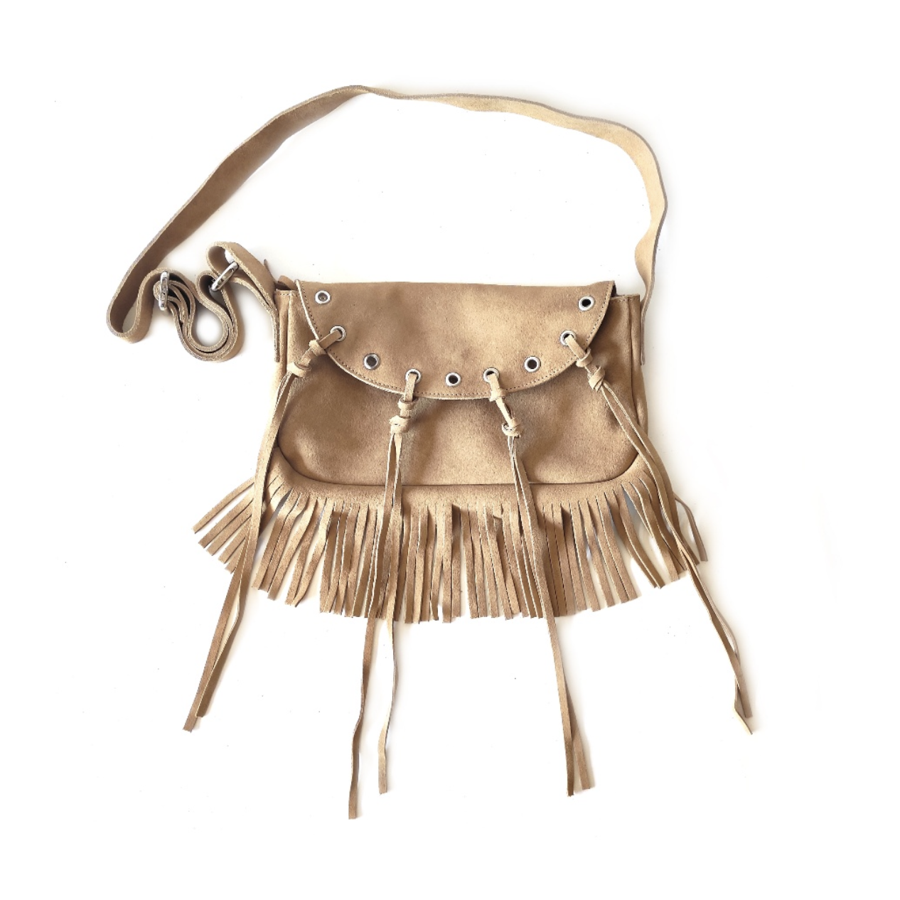 Borsa a tracolla in suede beige con frange e borchie in metallo.