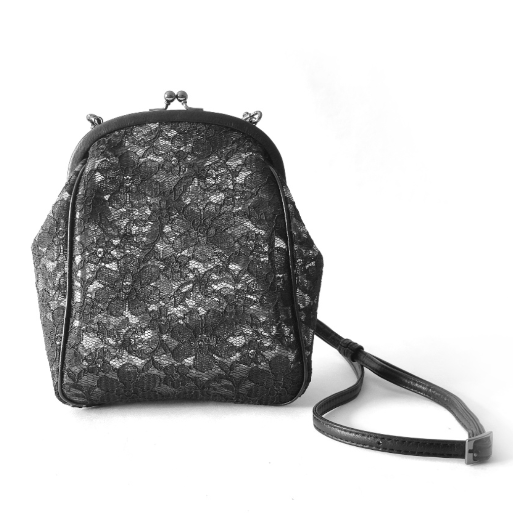 Borsa a tracolla in PVC e pizzo nero chiusura a fermaglio e tracolla.
