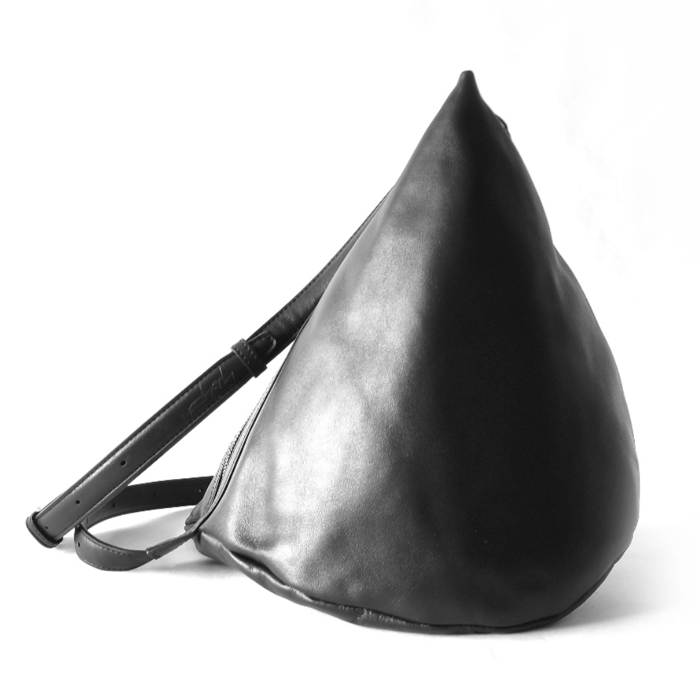 Borsa a sacca in pelle nera con tracolla monospalla.