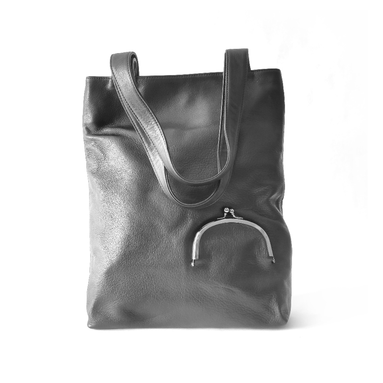 Tote bag in pelle morbida nera con dettaglio metallico.