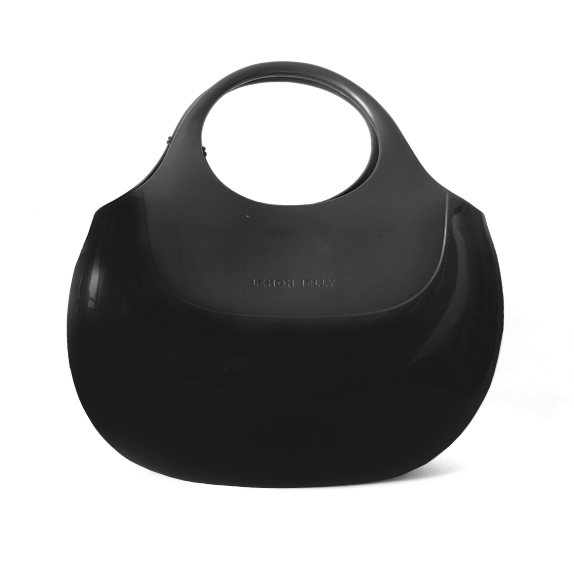 Bauletto in ecopelle nera con dettaglio di fiocco in pvc, tracolla in techno webbing.