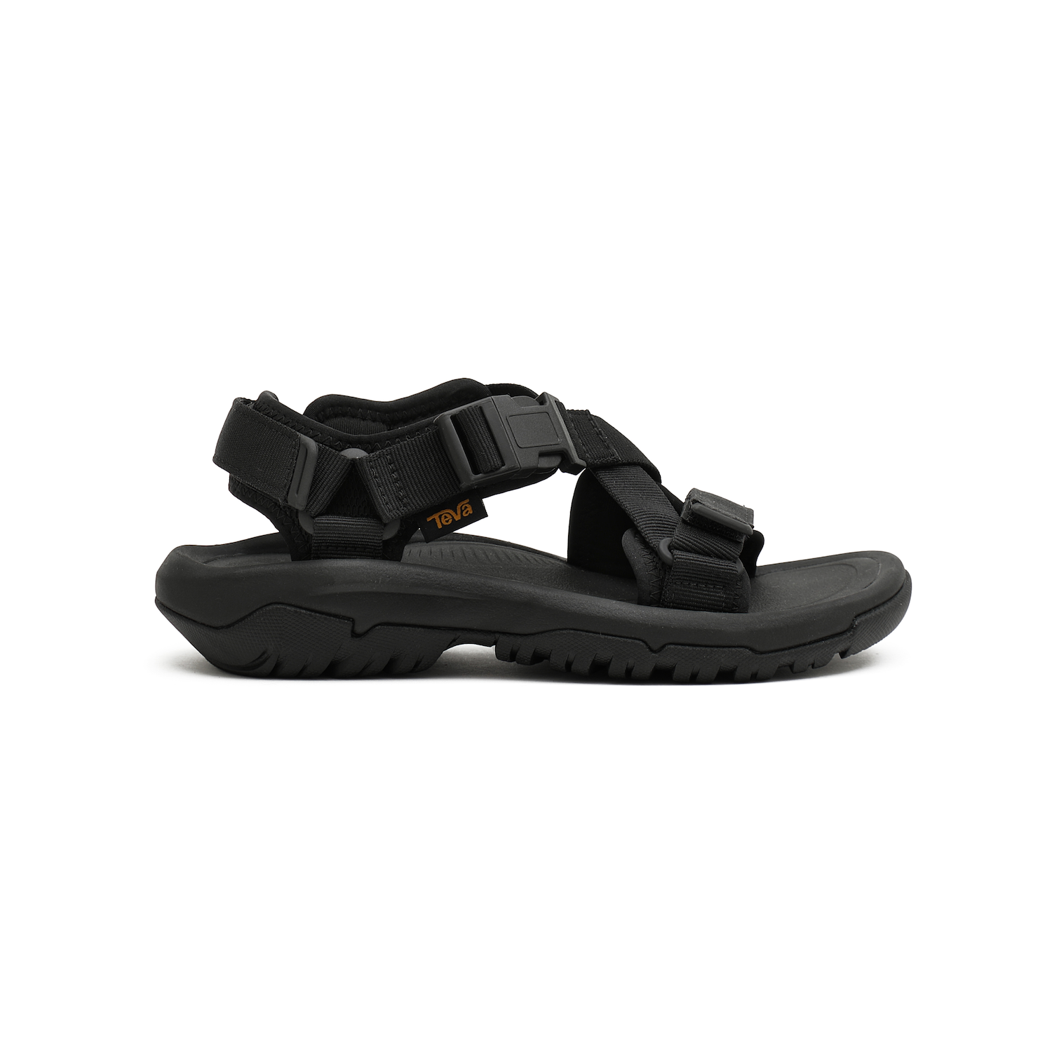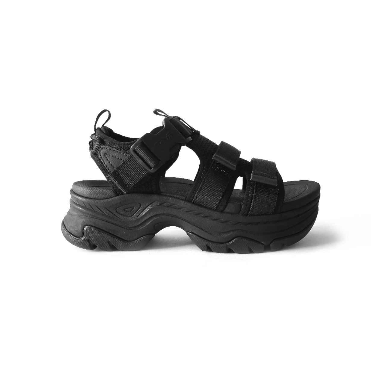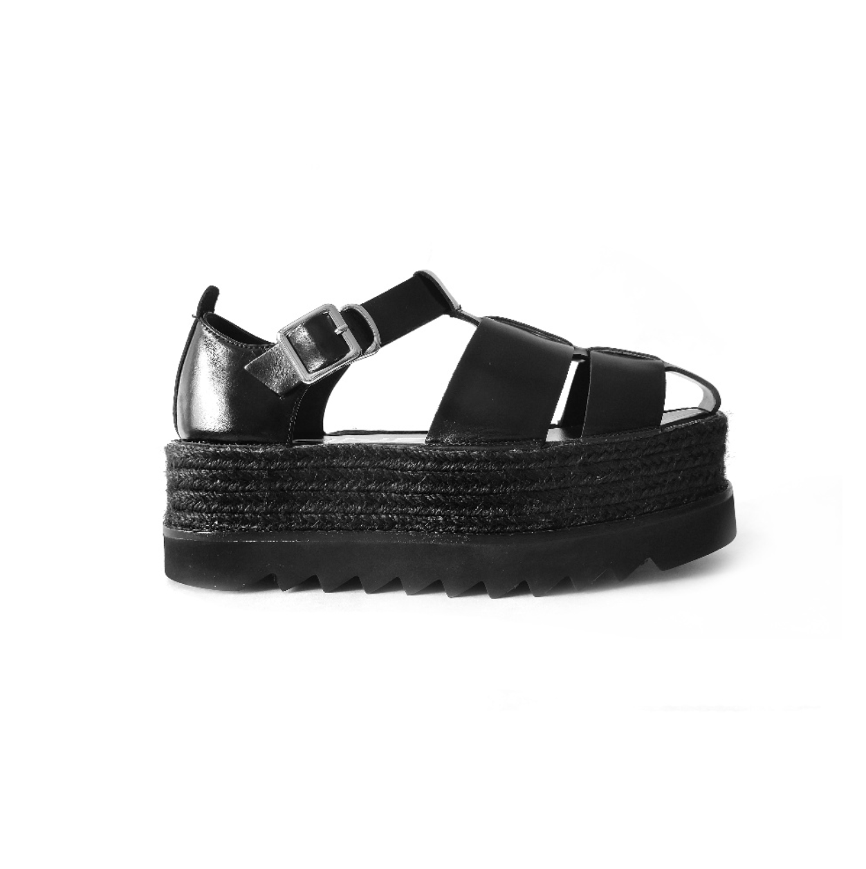 Sandalo fisherman in pelle nero con maxi suola in rafia e fondo gomma