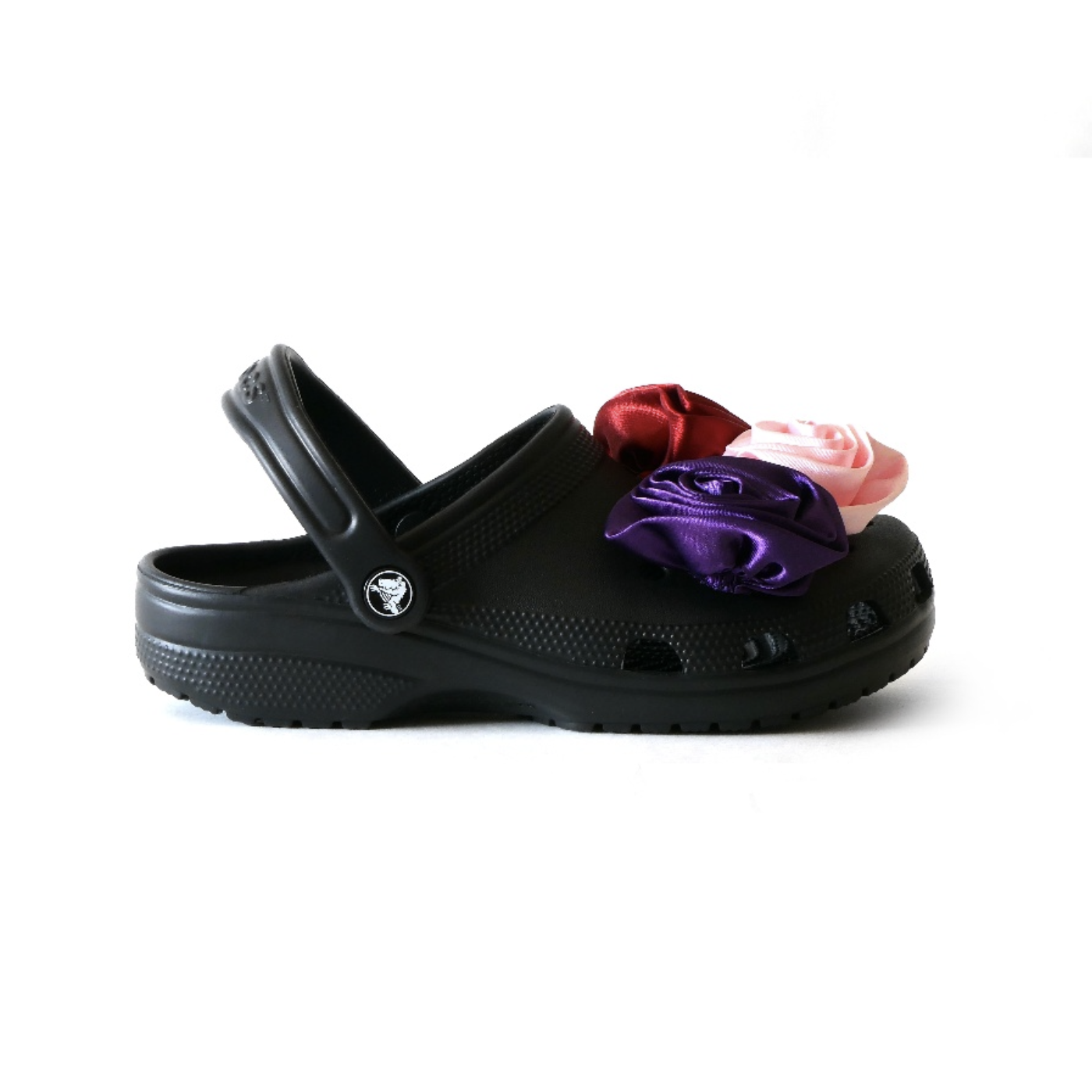 Sandalo in Croslite™ e rose decorative removibili in tessuto broccato.