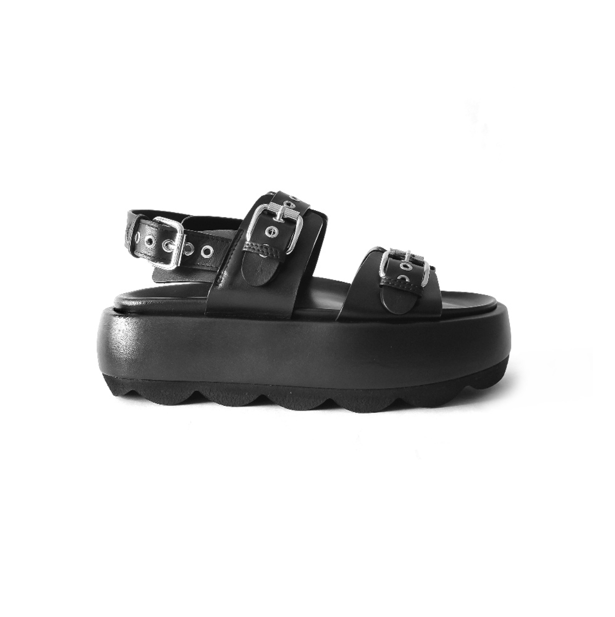 Sandalo in pelle decorato da maxi fibbie ed anelli metallici.