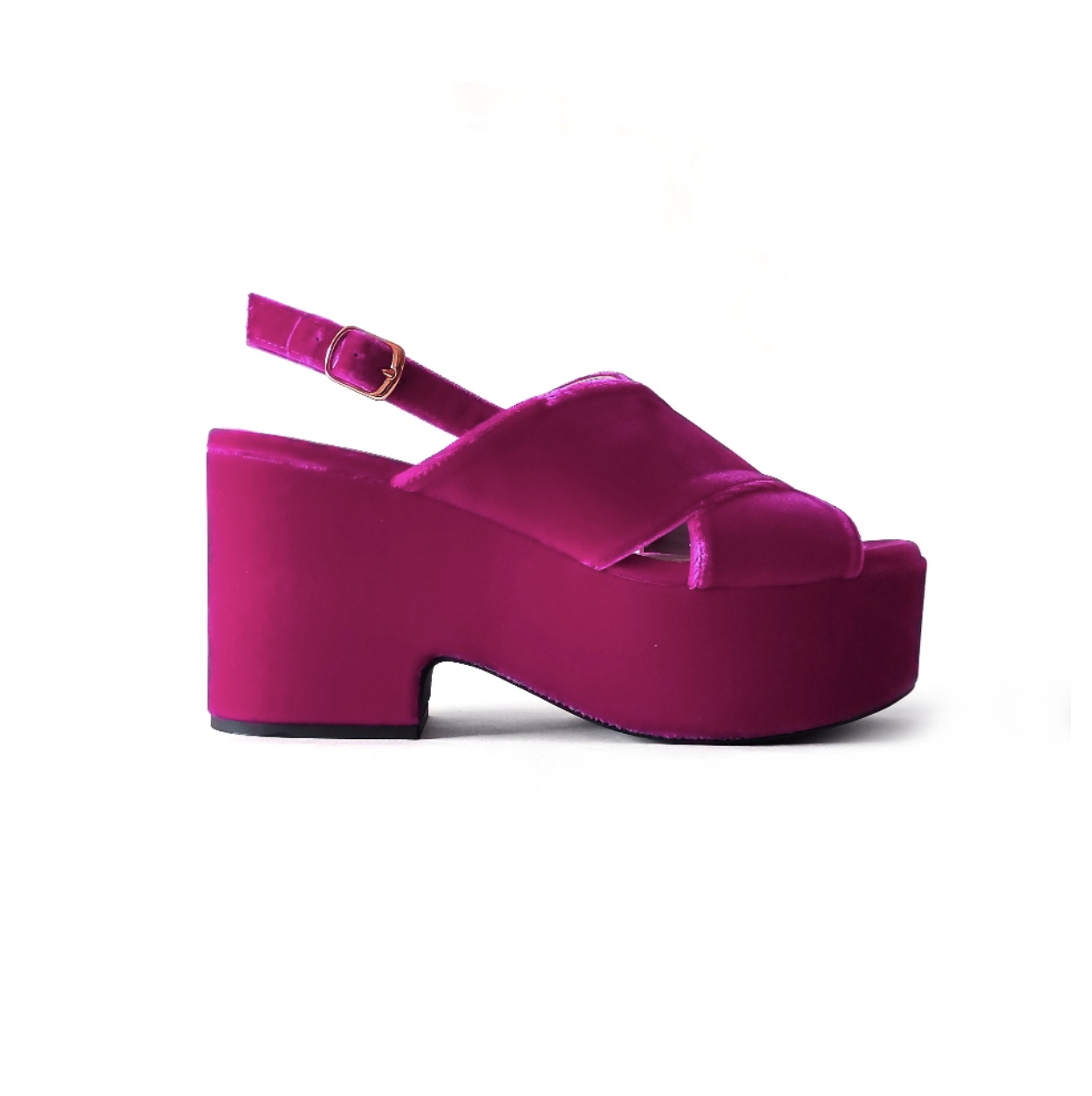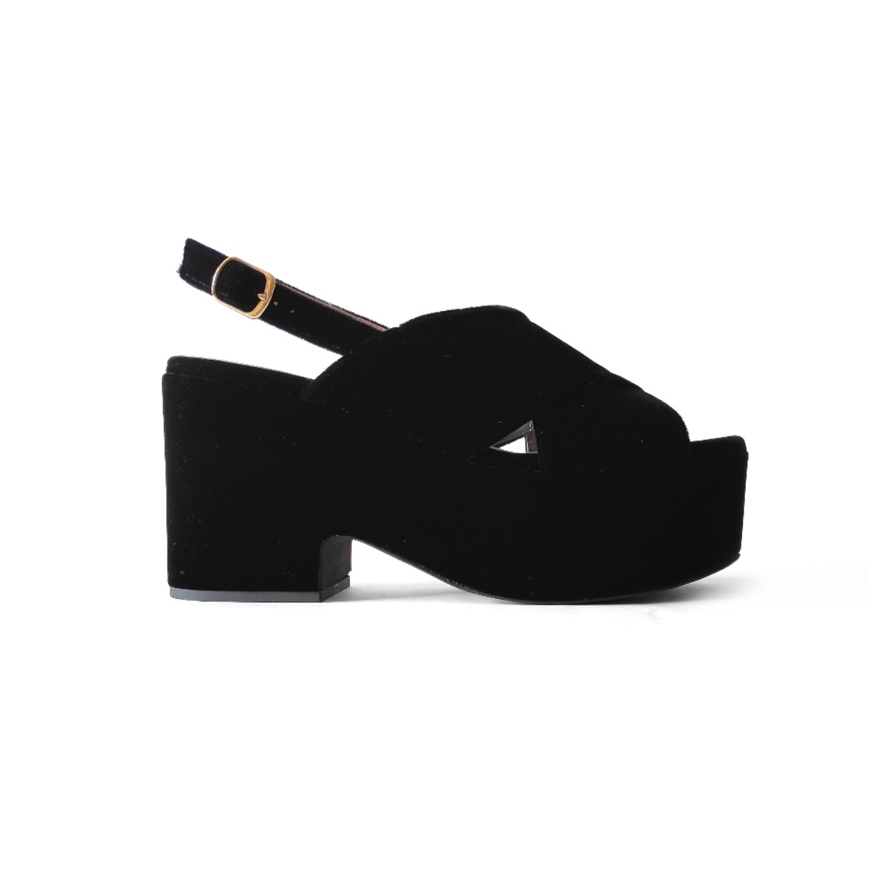 Sandalo con tacco alto 14 cm e plateau in velluto nero.