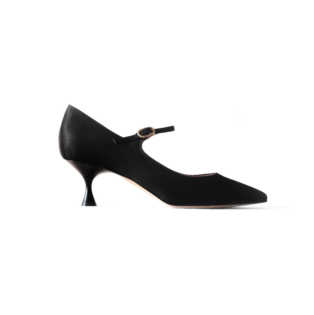 Mary Jane in tessuto moiré nero, bordo in gros-grain, suola in copertone.
