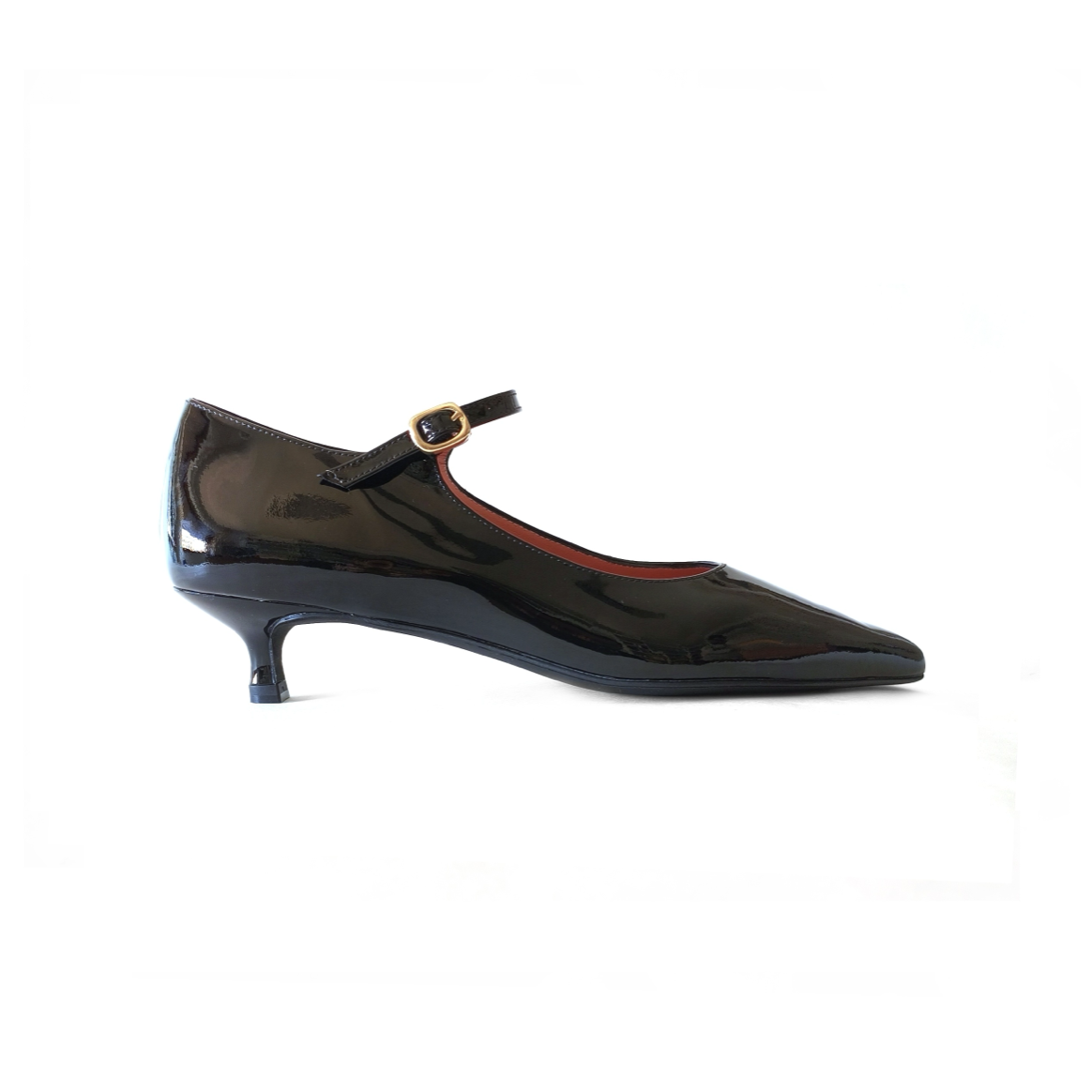 Décolleté mary jane con cinturino, tomaia in vernice nera e tacco kitten