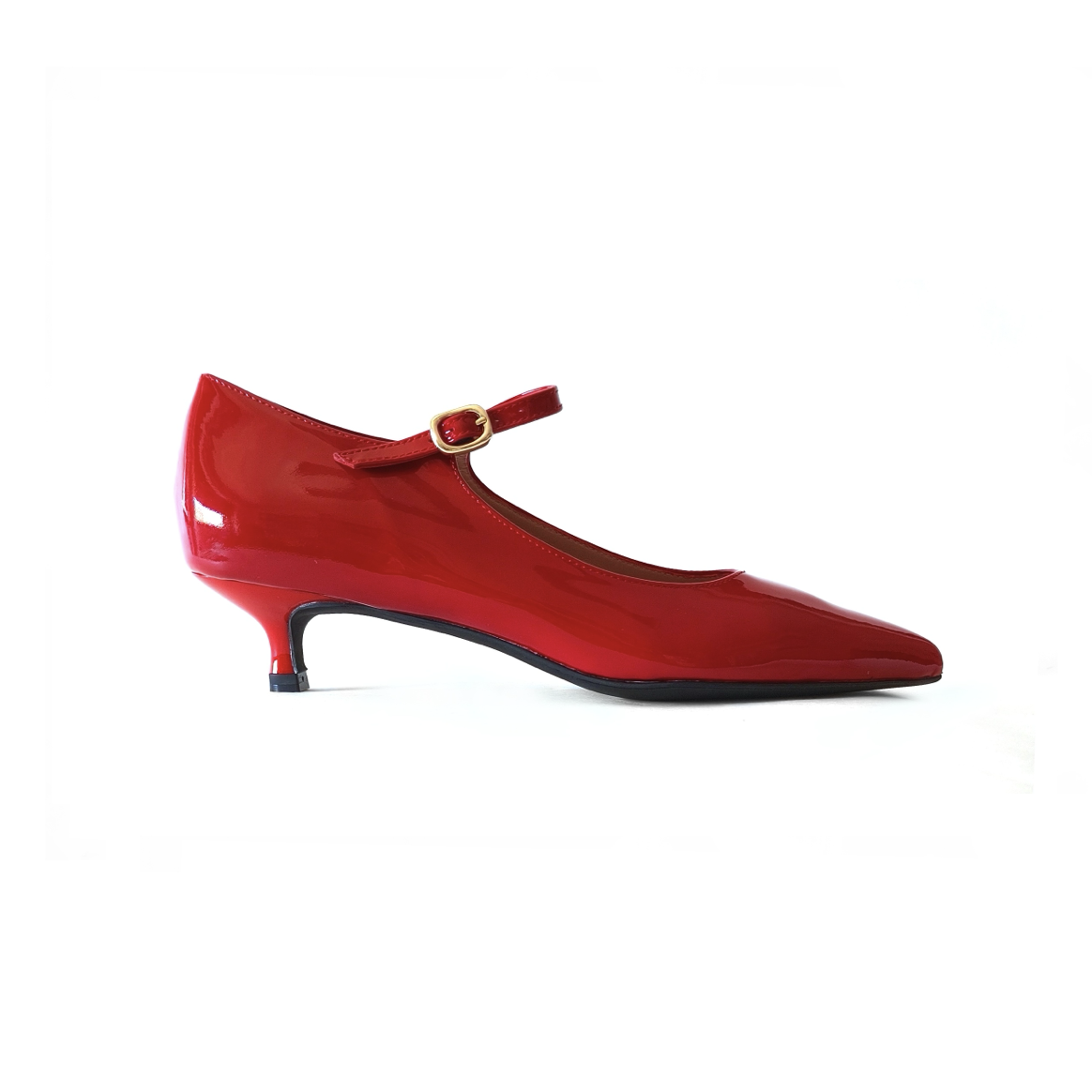 Décolleté mary jane con cinturino, tomaia in vernice rossa e tacco kitten