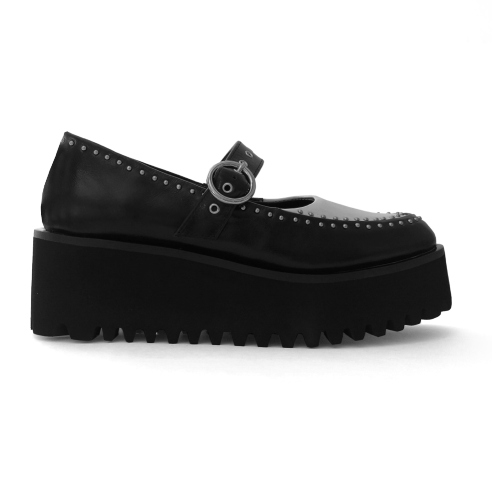 Mary jane platform creeper, tomaia in vitello spazzolato bicolor decorata da micro borchie, fondo platform in gomma