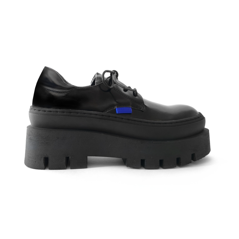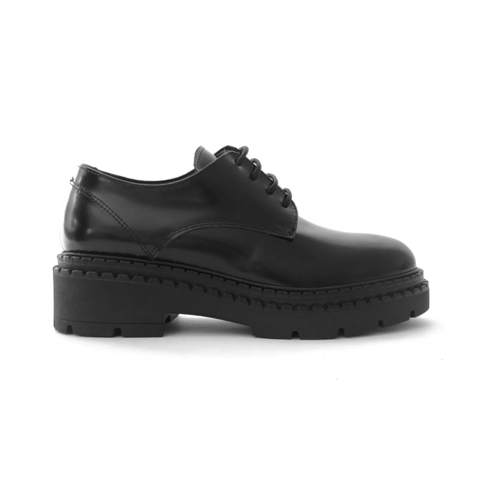 Stringata in pelle nera con fiocco e maxi suola in gomma.