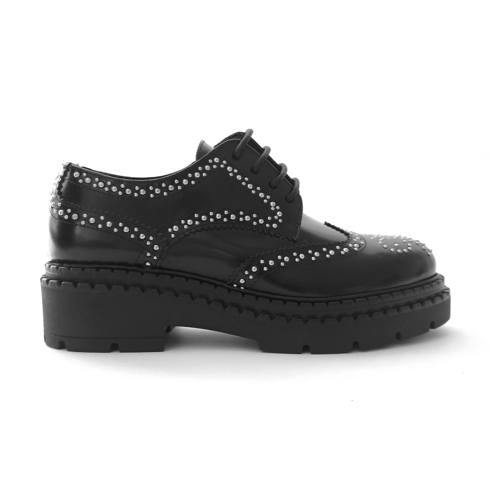 Derby allacciata, tomaia in vitello spazzolato decorato da borchie, fondo in gomma sagomato