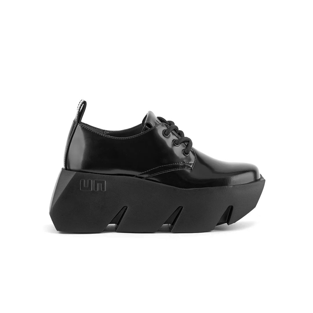 Stringata in pelle nera con maxi suola in gomma.